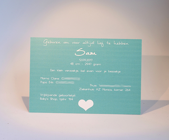 Wens je graag meer info, een specifieke aanpassing in tekst of kleur of bijhorende wikkels/stickers ?  Stuur een mailtje naar info@prettyprints.be met als referentie de naam van het kaartje.