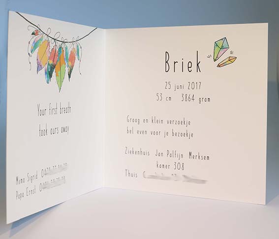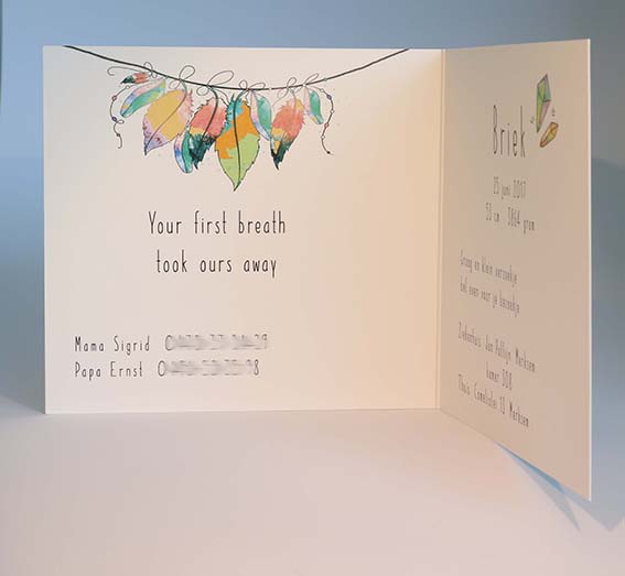 Wens je graag meer info, een specifieke aanpassing in tekst of kleur of bijhorende wikkels/stickers ?  Stuur een mailtje naar info@prettyprints.be met als referentie de naam van het kaartje.